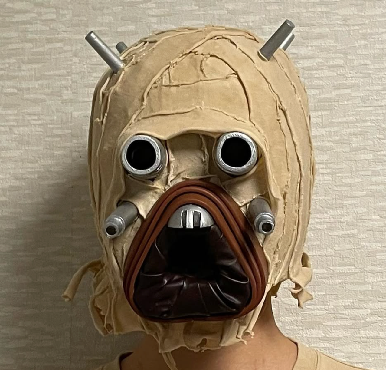 スタウォーズよりタスケンレイダーのマスクを制作 ダンボール コーヒー染したTシャツ 百均のレザーベルトを使用